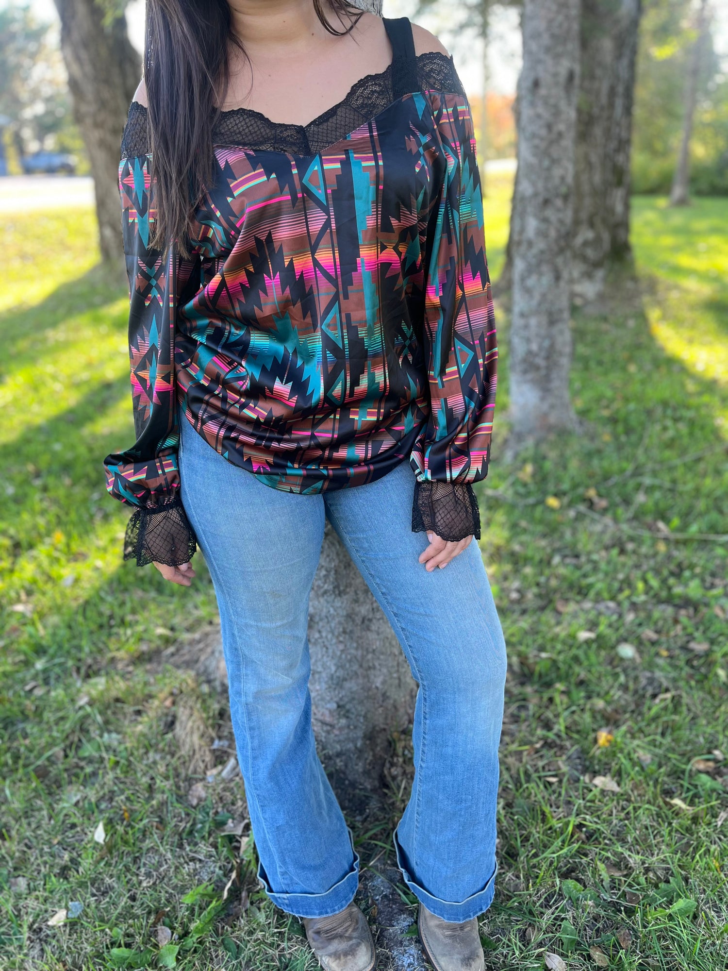 Pretty Aztec off the shoulder with black lace long sleeve. These fit roomy